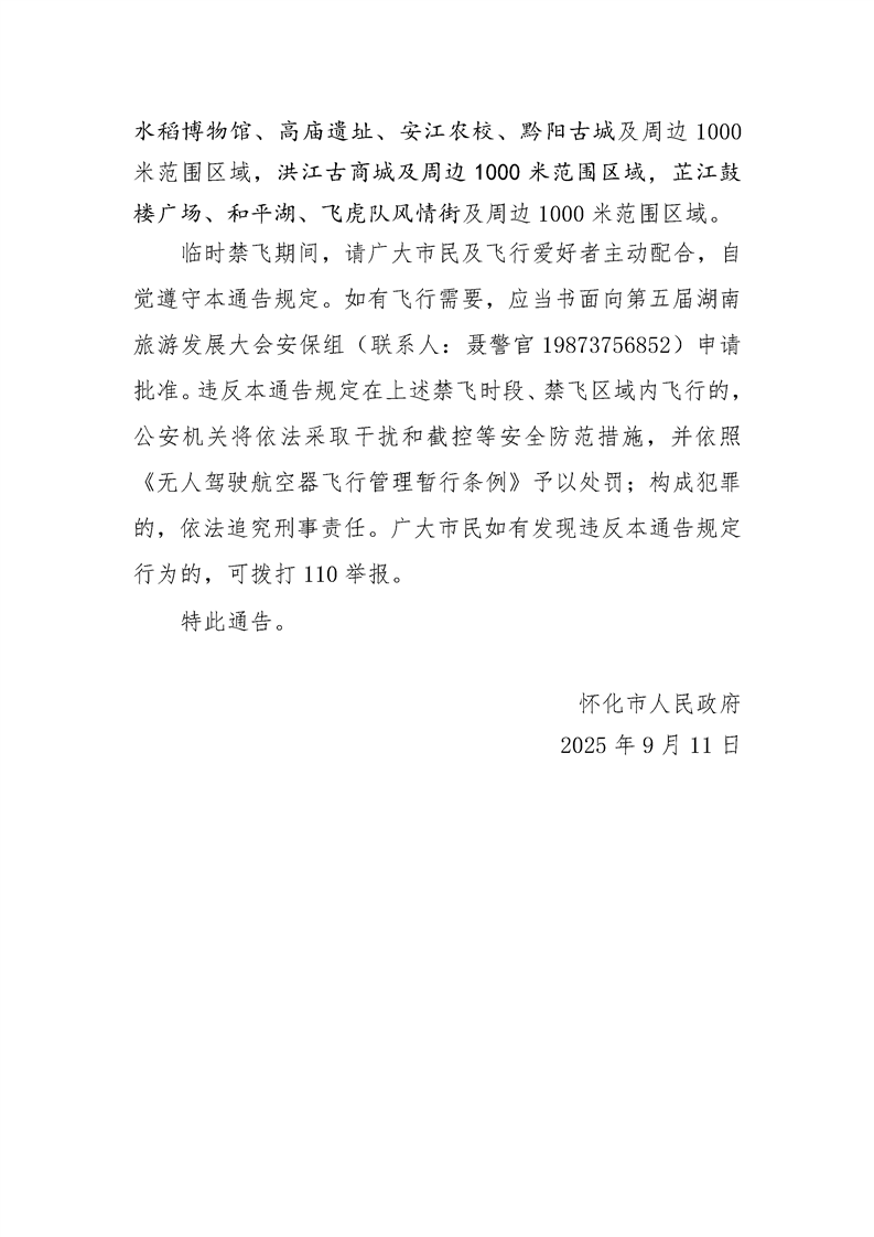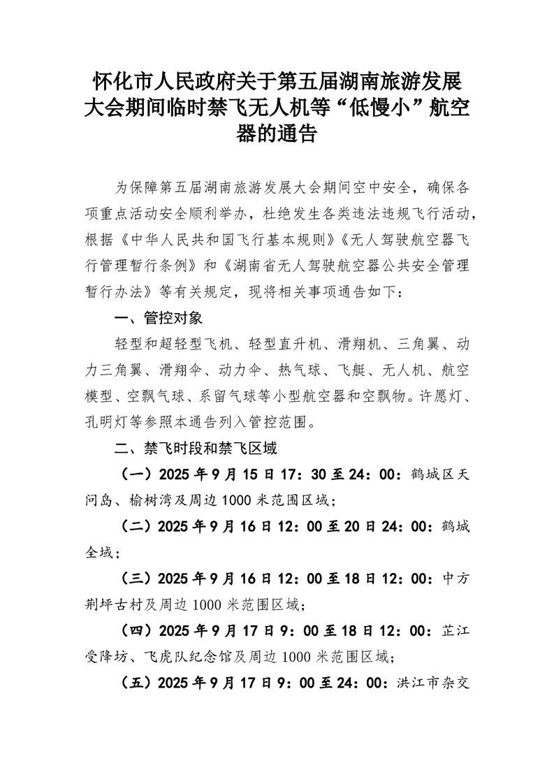 懷化市人民政府關(guān)于第五屆湖南旅游發(fā)展大會(huì)期間臨時(shí)禁飛無(wú)人機(jī)等“低慢小”航空器的通告