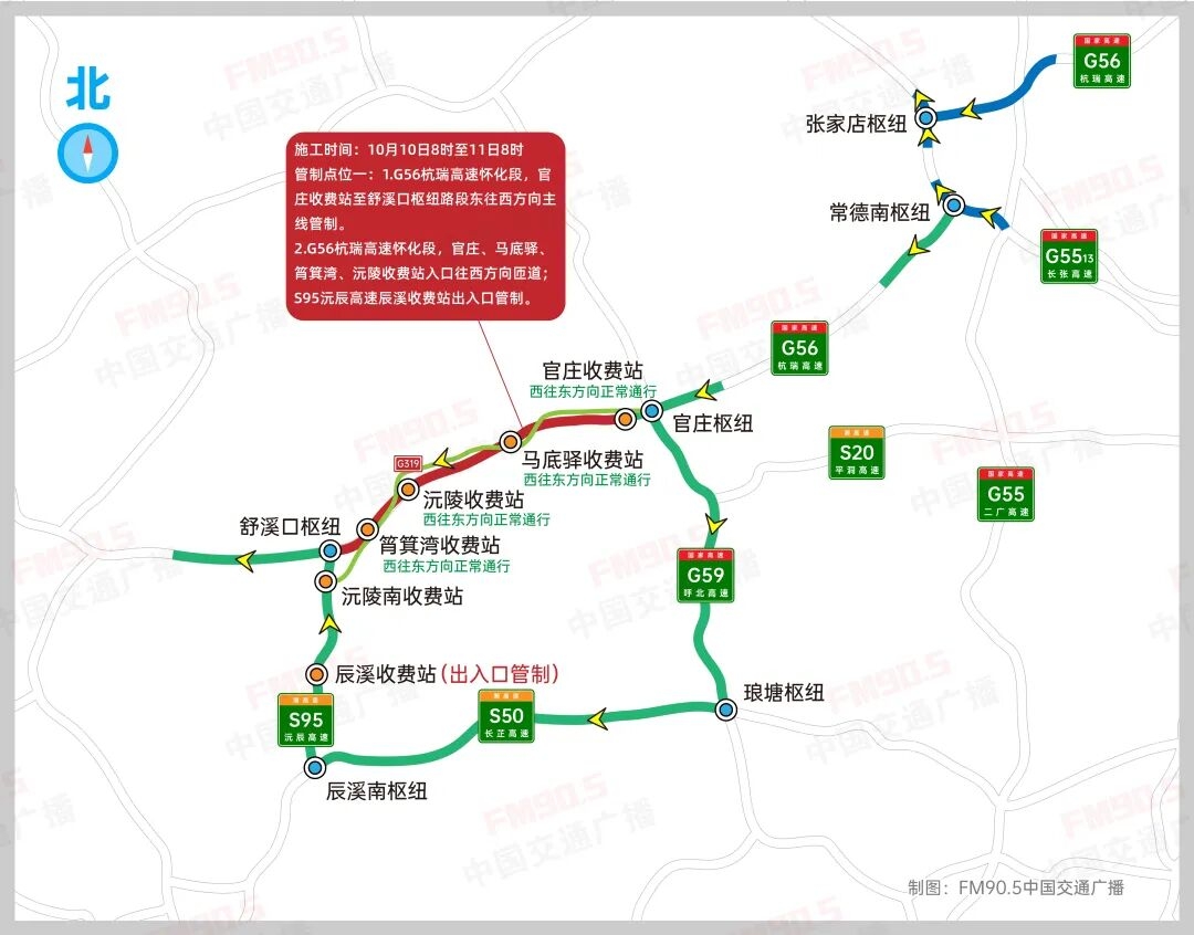 1.G56杭瑞高速懷化段,官莊收費站至舒溪口樞紐路段東往西方向主線管制。